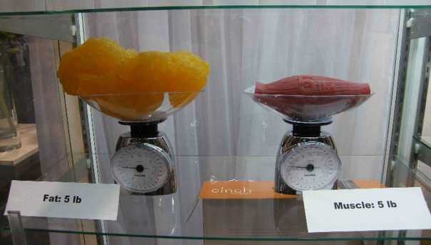 Muscle takes up about 20% less space than body fat. So that is why really muscular people weigh more even though they look lean and why as you do body recomp, you’ll notice the scale isn’t moving but you are losing inches overall.